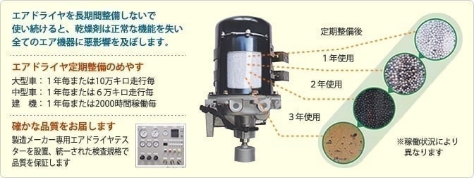 トラック・バス・建機などの多くの車輌はコンプレッサーから送られる圧縮空気を利用してブレーキやサスペンションなど、さまざまなシステをムコントロールしています。圧縮空気の中には大気中に含まれている「水分」やコンプレッサーの中を潤滑している「油分(オイル)」が含まれており、それらの「水分」「油分」が各システム内に侵入すると様々な不具合を引き起こす原因となります。エアドライヤは各車両のエアコントロールシステムに「水分」「油分」の侵入を防ぐ役割を果しております。定期点検やメンテナンスを怠ると、エアドライヤ内の乾燥剤や各パーツの経年劣化によって、あらゆる機器へ悪影響をもたらします。走行期間1年または走行距離10万キロでエアドライヤの定期点検整備をお勧めいたします。当社では、製造メーカー専用エアドライヤテスターを設置統一された検査規格で対応しております。